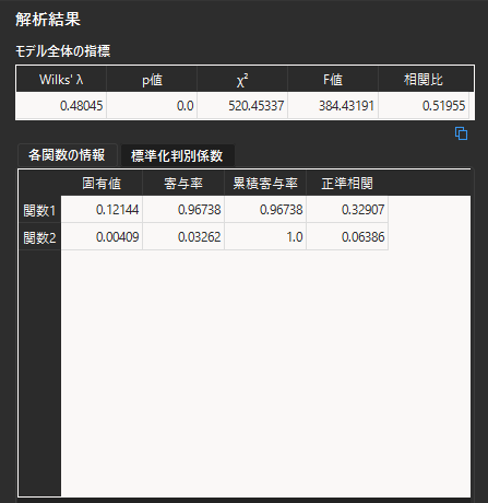 判別分析の解析結果について自動考察を行なうと,モデルの適合度と説明変数ごとの統計量,標準化判別係数について,以下のような考察結果を得ることができます.