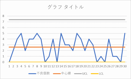 Excelの折れ線グラフ機能を用いて,管理図を作成します.グラフ用に算出した表から,不良個数と中心線・UCL・LCLの列を選択します.