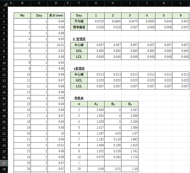 今回の解説で使用するデータは,1日ごとに20サンプル(n=20)を抽出したネジの長さデータの6日分になります.1日のサンプルを1つのグループ(群)として,以下のようなX-s管理図を作成する方法を解説します.