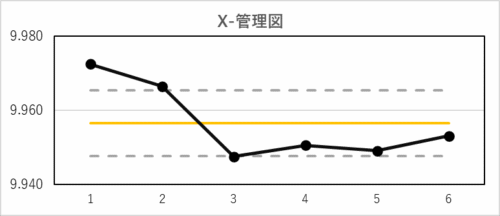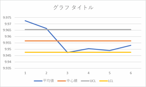 縦軸の値の調整や,中心線やUCL,LCLの線を変更するとより管理図らしいグラフとなります.