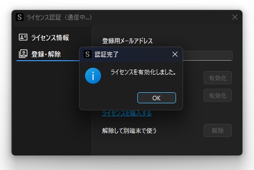 利用する端末から購入時に設定したメールアドレス(= ライセンスキー)を登録することで,ライセンス認証(利用端末の登録)が完了して解析機能を利用することができます.