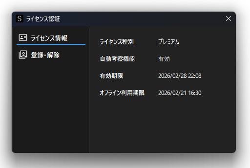 4.「ライセンス情報」から有効化されているライセンス種別を確認することができます.トライアル版は端末登録から7日間有効です.オフライン利用期限内は,インターネットに接続を行わなくても解析機能を利用することができます.